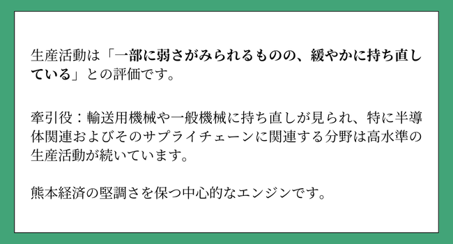 熊本県内の景気は、前回報告(7月)から判断を据え置き、「緩やかな回復」基調にあります。
