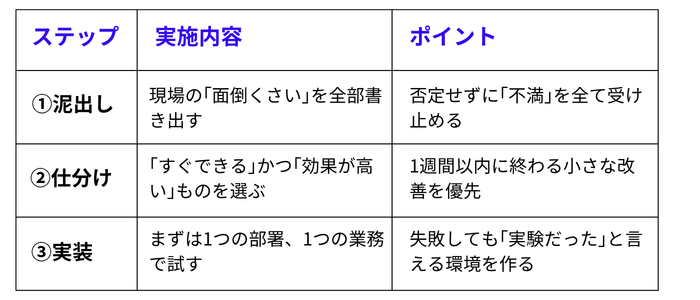 ・処方箋:「毎週水曜の最後の30分はPCを閉じて改善会議」など、強制的に時間を確保する。改善は「余裕がある時にやるもの」ではなく「余裕を作るためにやる業務」です。