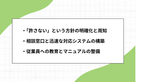 企業はまず、「カスハラは絶対に許さない」という毅然とした対応方針を経営層も含めて明確にし、全従業員に周知することが求められます。